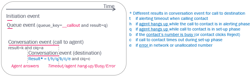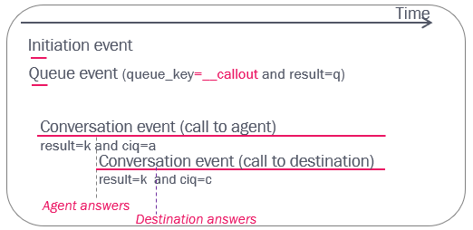 If the callout is answered by the destination number, the agent can transfer the call to another agent, to a phone number or to a queue. If the agent transfers to another agent, this new agent’s conversation event will also get ciq='a' since this is in the same 'ciq' session. If the agent transfers to a number, this number’s conversation event will have ciq=’null’.