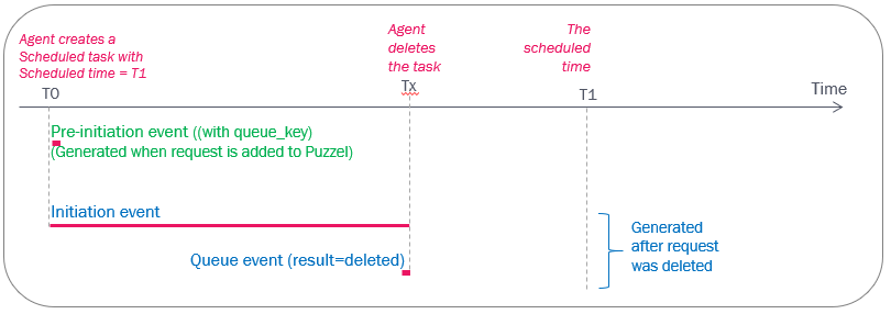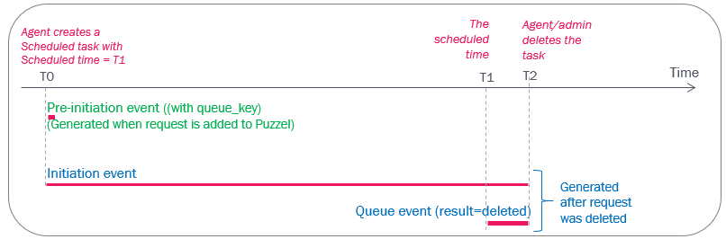 If a scheduled task is deleted after the scheduled time, that is, when it is shown as In queue but not yet sent to agent (e.g. because the reserved agent is not available), a queue event with start at scheduled time, duration until it was deleted and result=d is created, in addition to the initiation event.