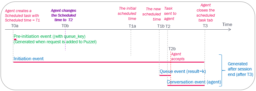 • When the agent has closed the task request tab (at T3), Puzzel creates the Initiation event (length until T3), Queue event (start at T1b) and Conversation event, and the call_variables (from db v1.7)