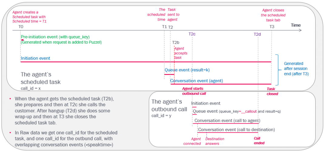 • If the agent makes an outbound call by clicking on the Call button in an open scheduled task in agent.puzzel.com, this call (2) will contain the scheduled task’s (2) call_id/session id as related_call_id/related_session_id.