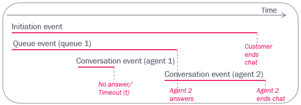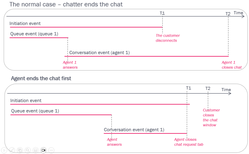 • If the agent tries to end the chat before the chatter has disconnected (e.g. if the chatter does not answer), the agent will get a warning, and if agent still ends the chat, the Initiation event Finish will be some ms later than the Conversation event's Finish (T1). In this case the chatter will see that the agent left the conversation and the chat has ended.