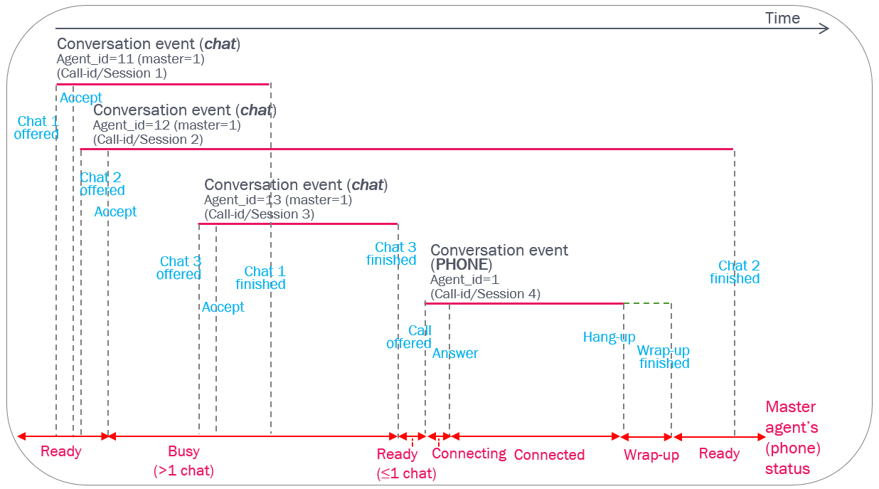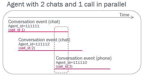 There might be more than one chat Conversation event for the same agent for the same time interval (in different call_ids), and there might be a phone Conversation event covering the same time period as one (or more) chat Conversation event(s).