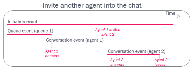 Agent 1 can invite agent 2 into an ongoing chat with the end-customer. This will result in a new Conversation event for agent 2. (Today, this event for agent 2 contains the same queue_key as the event for agent 1, but the queue_key in agent 2’s conversation event might be removed in a future release of Puzzel). Agent 1 or agent 2 may leave the chat first. If agent 1 leaves first, this is similar to a (consult and a) transfer, so the conversation event for agent 1 will have call_transfer=1. If agent 2 leaves first (agent 1 continues the chat), the conversation event for agent 1 will have call_transfer=0 (no transfer, this was only a consult).