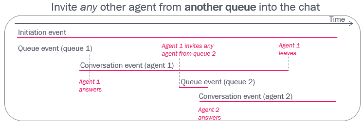 The agent may also invite any agent from another queue (the first ready agent will be offered the chat). This will result in a new Queue event and a Conversation event for the agent that gets the chat from the queue.