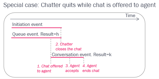 • The Conversation event represents the time the agent had the chat request open, and the last part when the chatter has disconnected might be short or long.