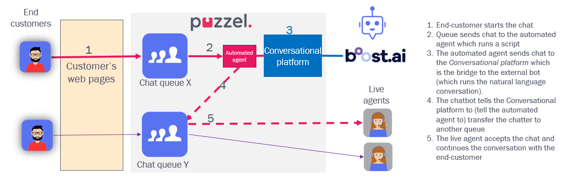 A chat queue can be answered by an automated agent (running a script) and possibly also a chatbot (e.g. boost.ai) instead of live agents. An end-customer that starts a chat pointing to a queue answered by automated agent(gs) (and a chatbot) is sent to a Puzzel agent that runs a script. If a chatbot is used, the communication between Puzzel and the chatbot-platform goes through the Conversational platform. Each Puzzel agent can handle max 8 concurrent chats, so you may need more than 1 Puzzel agent.