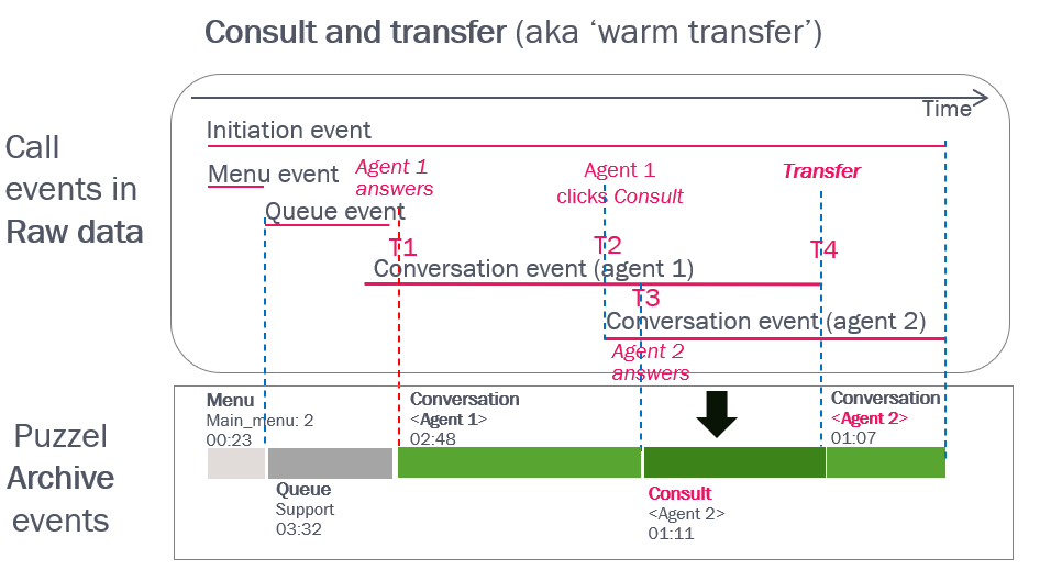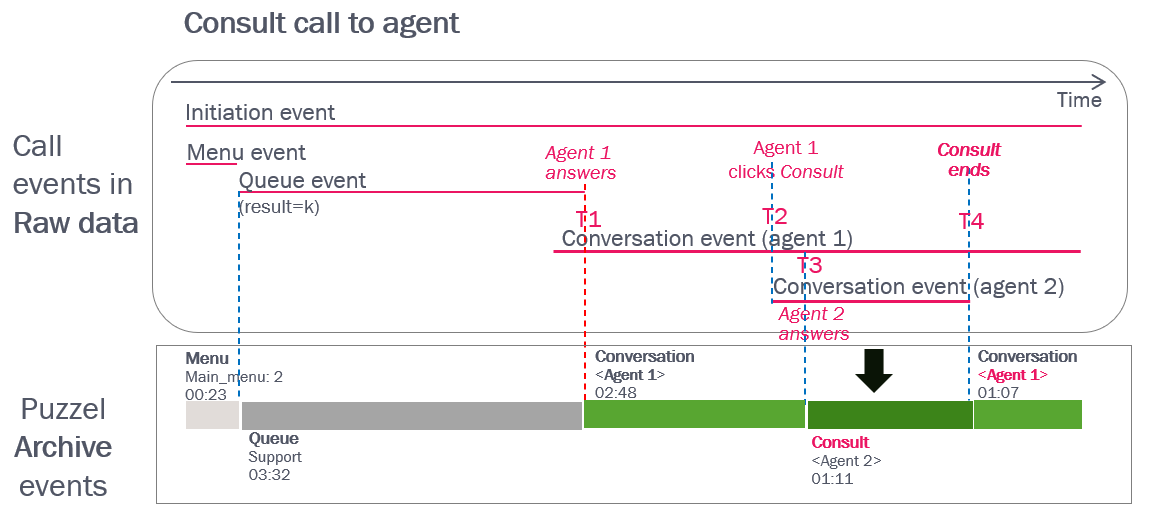 From March 19th 2025 we introduced a new Consult to queue event in Archive to better visualize consult to queue. For a Raw data Queue event that has its duration at the same time as a Conversation event's speaktime, we generate a Consult to queue event for Archive, and we shorten the Conversation event accordingly.