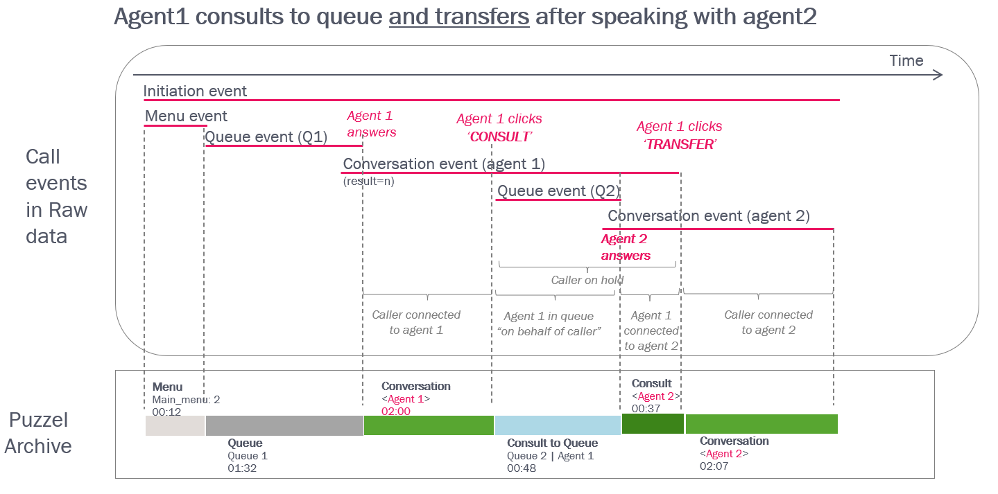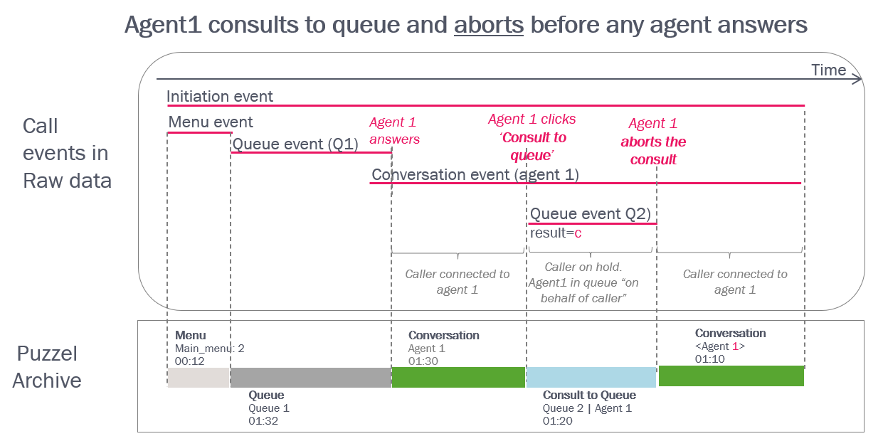 If agent1 starts a consult call to queue, agent1 waits in queue before being connected to agent2, and then agent1 returns to the caller or transfers to agent2. This results in a new Raw data Queue event at the same time as agent1's Conversation event is ongoing.