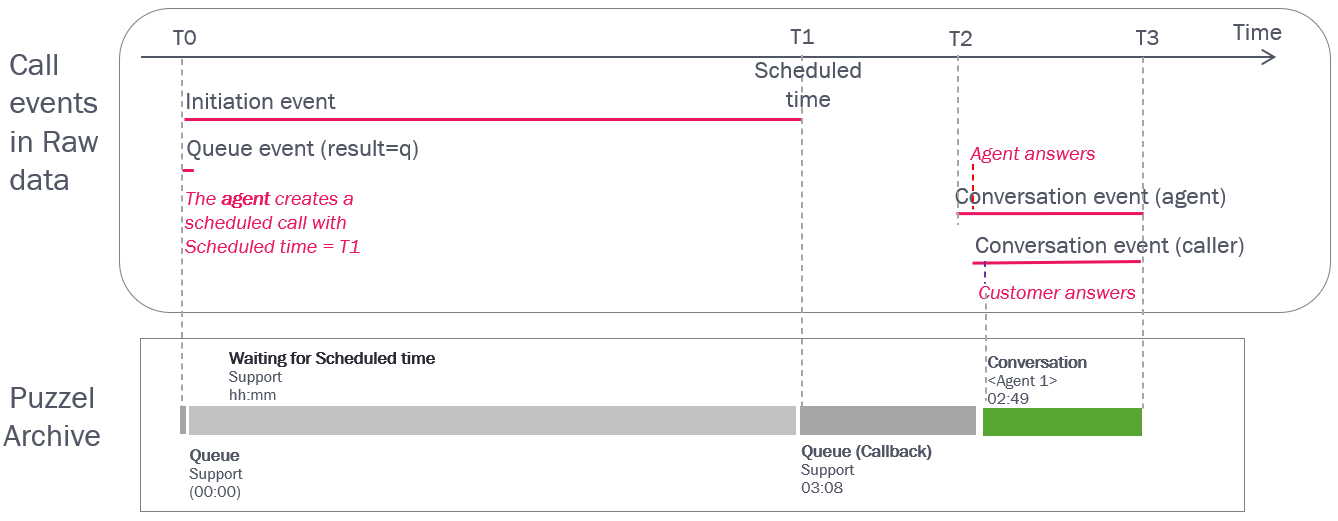 If an agent at T0 creates a Scheduled call to 'Myself' with Scheduled time T1, we generate these Raw data records and these Archive events. Please note that it appears in Archive after the call has been done (after T3), and it's not shown in Archive if the Scheduled call was deleted before it was done.