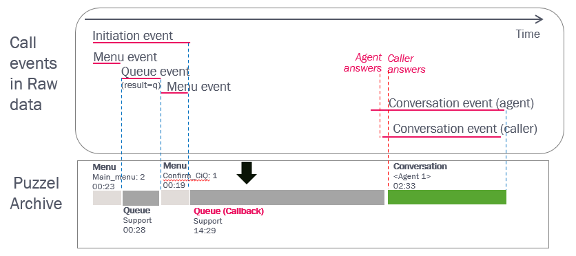 • For the time between the caller hung up after having ordered callback and the point in time the caller and the agent was joined, we generate and show a "Queue (callback)" event in Archive. The Raw data queue event ends when the caller left the queue to order callback.