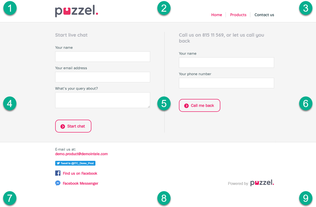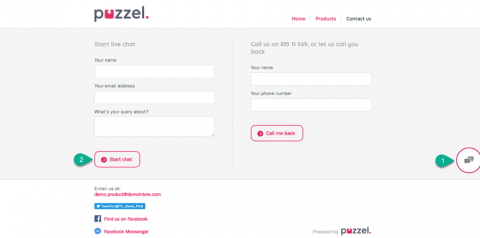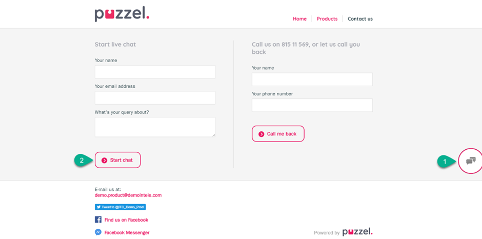 The default setting for making Puzzel chat available on your web page is through a chat starter circle. This is a chat icon that appears on one of the sides of the screen, and appears as a layer over the rest of the web page. You can choose where you want the circle to appear by defining its horizontal and vertical position (left-center-right | top-middle-bottom).