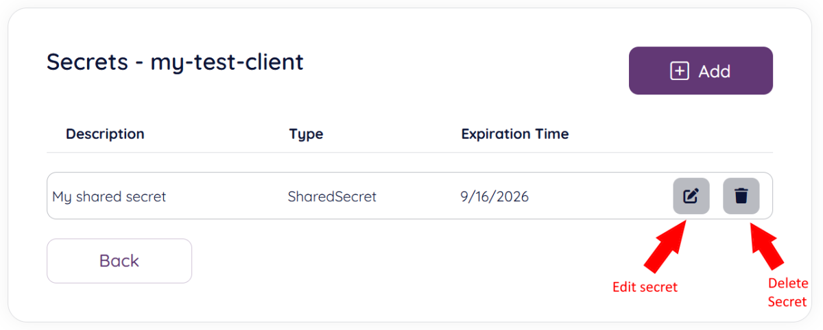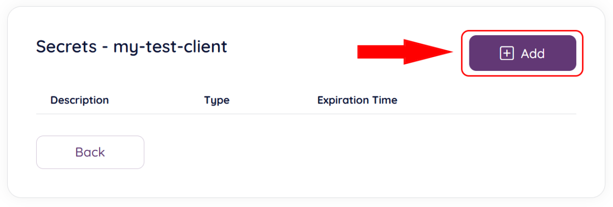 To add a secret to your client, click the “Manage Client Secrets” icon as shown below: