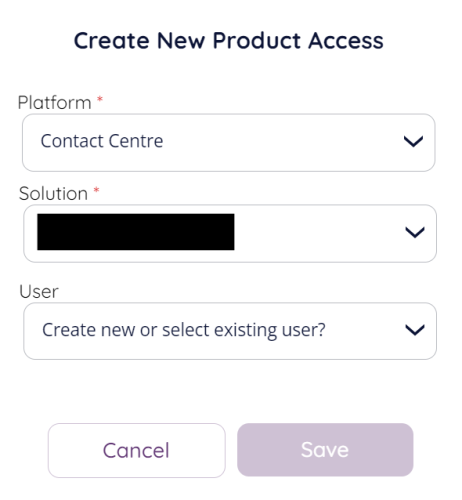 After choosing the platform the solution list will be populated with the solution(s) your account have for this product (platform), this might be none. If you have multiple solutions for a product / platform the choose the one containing the platform user you want to link up / create.