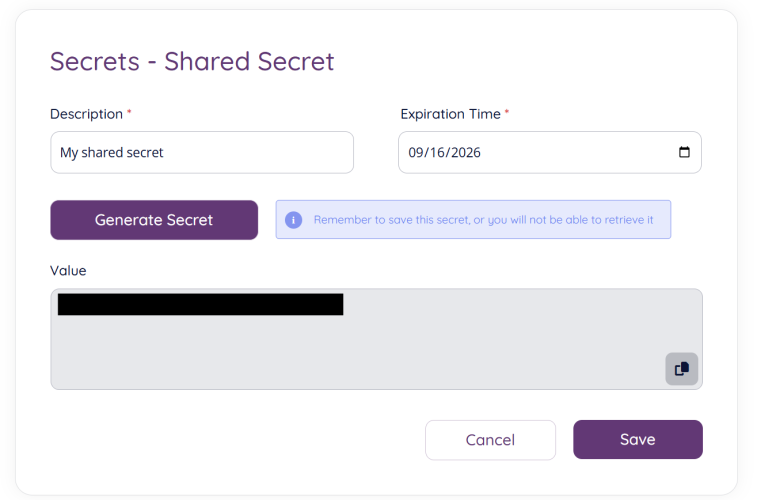 When selecting “Shared secret” from the “Add” button”, a new secret will be generated and you will be able add a description for your secret and also an expiration time. The expiration time can be edited at a later stage.