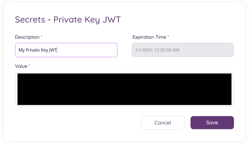 You will need to add a decription for your new secret. and add either a base64 encoded X.509 certificate or a JSON Web Key formatted RSA, EC or symmetric key in the “Value” field. The expiration time will be extracted from the provided certificate or key.