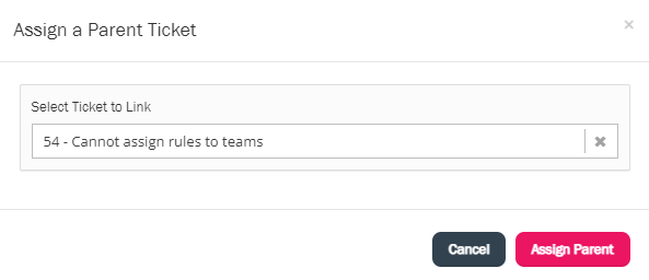 icon in the Parent and Child Tickets widget and search the ticket you want to assign as a parent to the current ticket by ticket number, user or subject. You will be presented with a list from which you can choose your parent ticket. Click Assign Parent button to link.