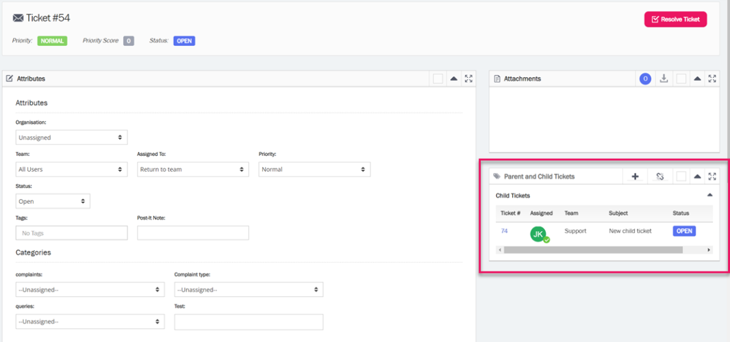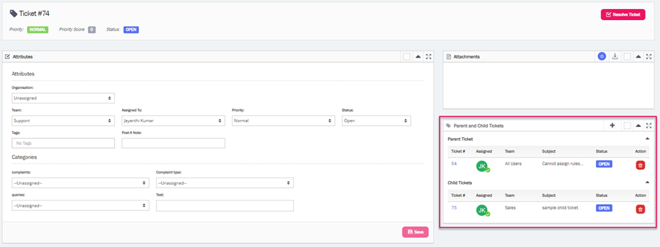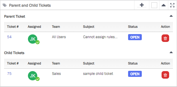 Parent and Child ticket feature allows agents to create new child tickets which link directly to the ticket they are currently working on, the Parent ticket. It is an efficient way of grouping all the related tickets to the present ticket so that they can monitor multiple conversations linked to the parent ticket. The Parent and Child Tickets widget will enable the agents to view all child tickets linked to it. Linked tickets will be shown provided that the agent has permission to view the ticket in the team which the child is assigned to.
