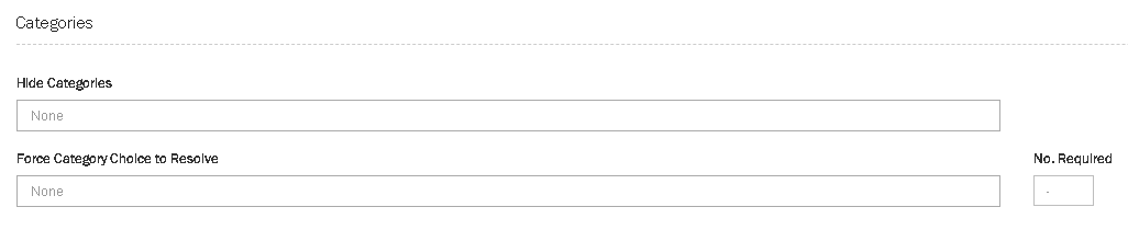 Force Category Choice to Resolve: Where used a Category is mandatory to resolve a Ticket. If a ticket is resolved without a category then a warning message will be given to force a category to be included. Categories are selected from the categories created in ticket attributes. As many categories as required can be included in this section; the No Required sets how many must be selected to allow the ticket to resolve. For example: it is possible to have 5 Categories, but only one is required.