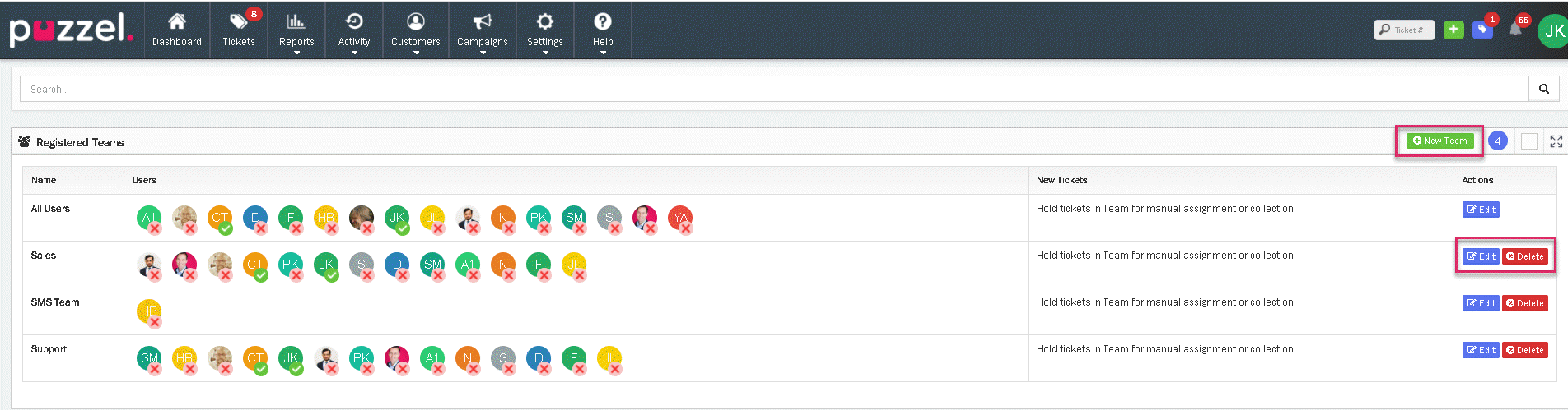 To create, edit or delete a Team, go to Settings->General->Teams. You can see a list of all teams or search for a particular team in the search tab above. All users in the team are also displayed against the team in the listing and options to Edit/Delete a team are also available.