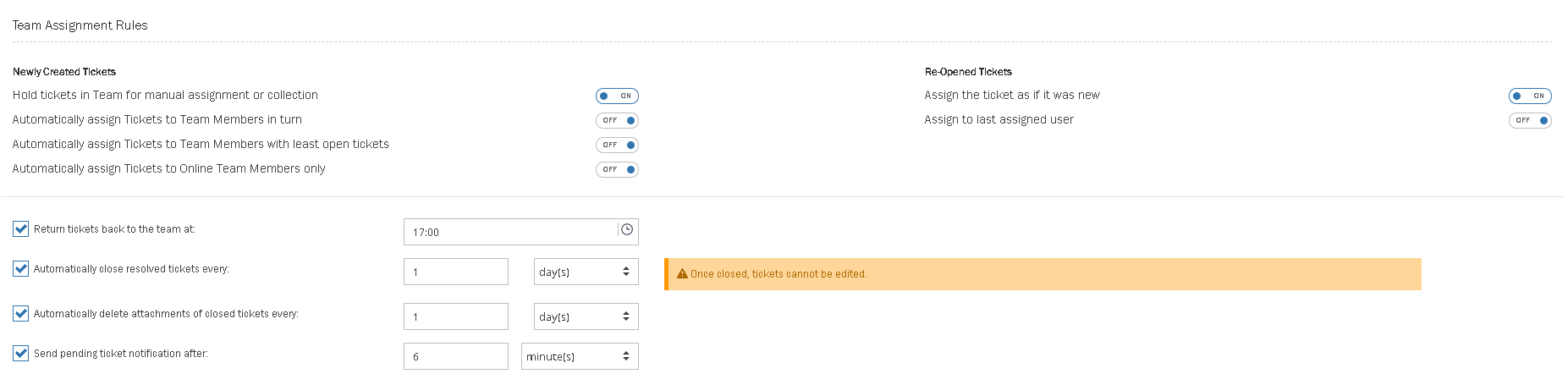 Closed tickets cannot be edited or reopened. This setting automatically closes resolved tickets every X duration selected. Please note that once tickets are closed they cannot be edited.