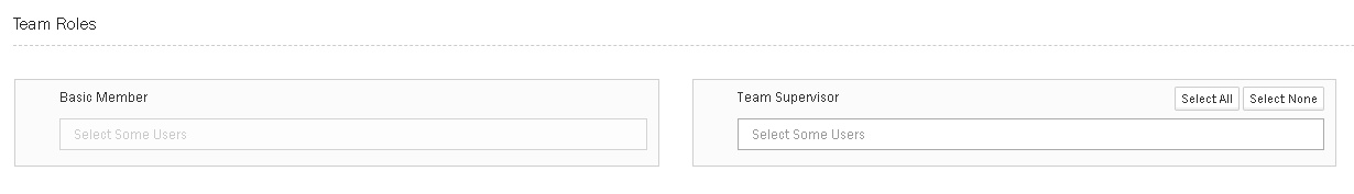 | Team Supervisor | A Team does not need to have a Supervisor, but where it does they have more access rights than a Basic Member. To update to a Team Supervisor click on the ‘Select Some Users’ box and this will then show the Basic Members in the team. When they are selected they are automatically moved from Basic Member to Team Supervisor. For ease of speed the options exist to Select All (adds all Basic Members to Supervisor) or Select None (removes all Supervisors back to Basic Members). |