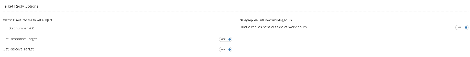 Text to insert into the ticket subject: When replying to tickets each team can include text which is inserted into the start of the email subject. For example this could be ‘Your Customer Enquiry #%T’ added to the start of the subject. #%T is replaced with ticket number when email sent.