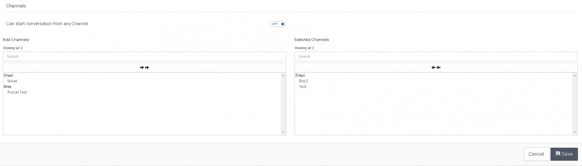 If set to OFF, the channels that must be used need to be selected manually, as below. If no channels are selected New Tickets cannot be created.