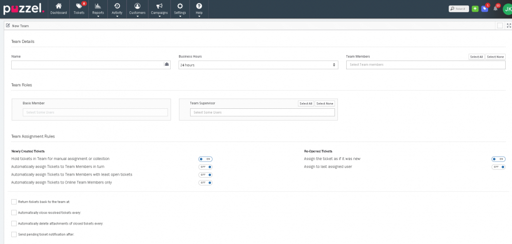 | Return tickets back to Team at | Moves any unresolved Tickets (open, pending, error) to unassigned at the time selected. This should be at the end of the working day for the Team. By selecting Automatically assign Tickets to Team Members in turn from Newly Created Tickets and then Return tickets back to the team at XX:XX, returns all unresolved tickets to the Team at XX:XX, redistributing the ticket load automatically across Users ensuring a balanced workload. |
