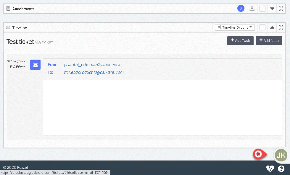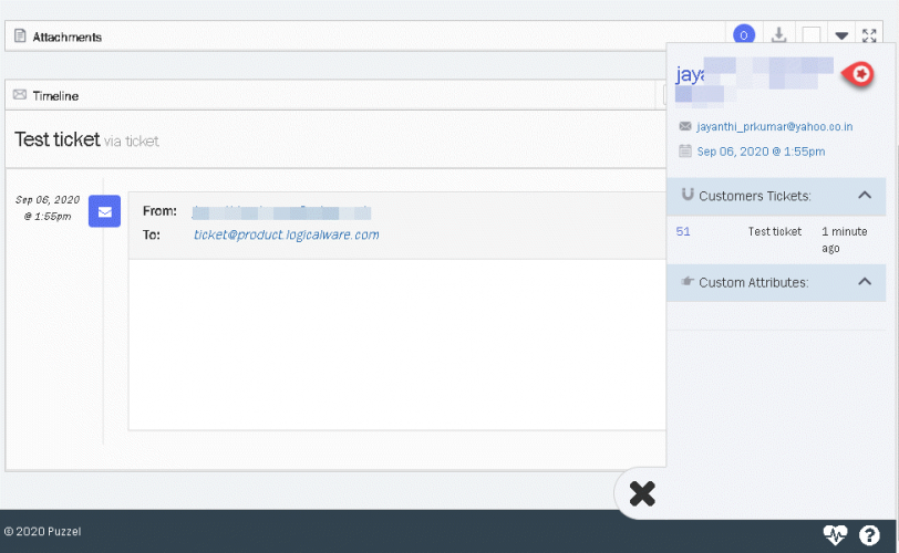 As a ticket is created the application checks to see if this belongs to an existing customer - using email address/mobile number as the unique identifer. If no customer exists that uses this identifer then a new customer is automatically created. Open the ticket to see the details and locate for the button with the initials of his/her name at the bottom of the screen as shown below.