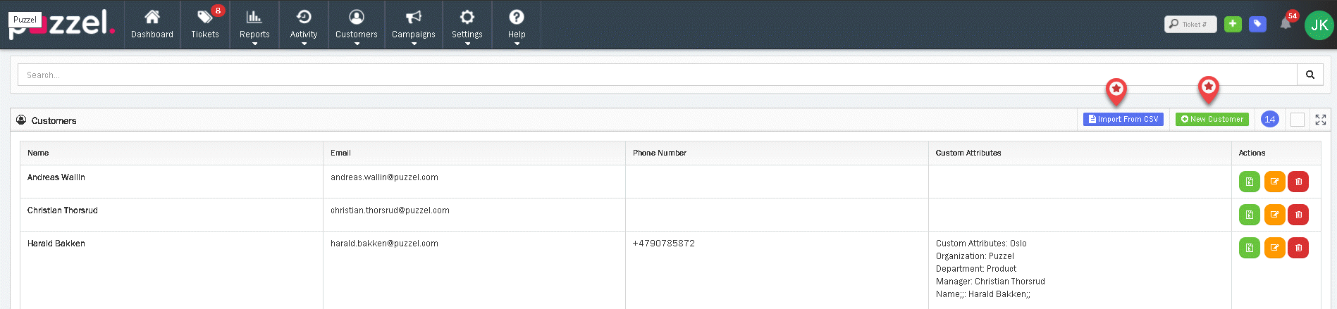 Furthermore, you have the option to permit customers to view and interact with tickets associated with 'Organisations' when they're logged into the Puzzel Customer Hub. This feature is especially handy if you wish to assign specific customers with the access rights to view and create tickets on behalf of certain organisations.