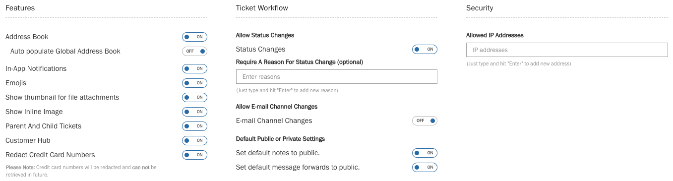 | Status Changes | When OFF users can only change ticket status by reply & resolve or reply & pending options when replying to tickets. When ON ticket status can be manually updated and saved |