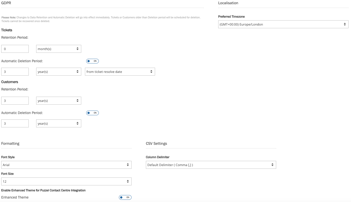 | Retention Period | Time duration for which customer data is retained before it is removed from the system. Customers cannot be removed if they still have associated tickets. You will be able to see a list of all deleted customers by going into Customers->Deleted from the main menu. Here you can find the User who removed the Customer, the time & date they were removed, a Customer reference number and partially redacted email address. |
