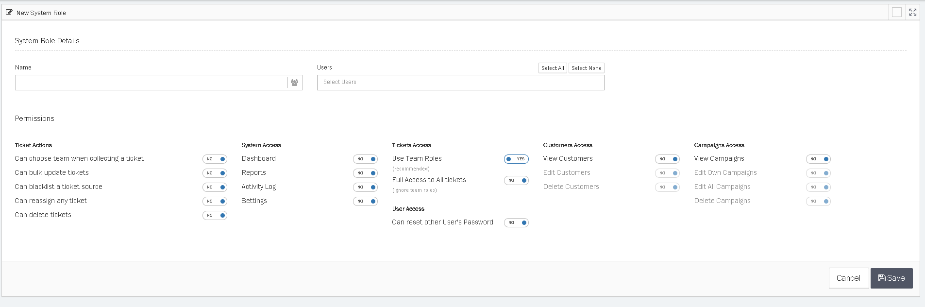 | View Customers | When ON can view Customers active records, attributes, all tickets against that customer and audit trail |