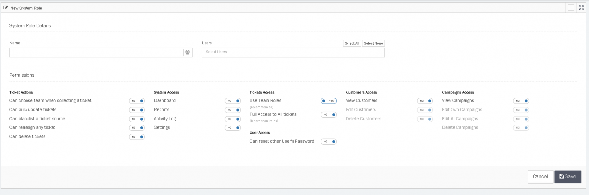 Instead of setting the System Access & User preferences of each individual User, System Roles let you create different Roles with different permissions and preferences to apply to Users all at once.