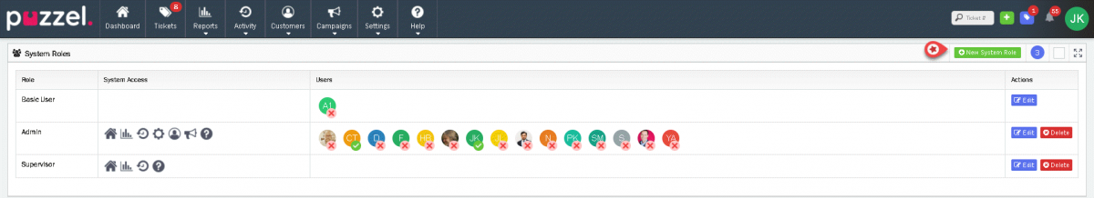 The same steps can be followed to edit an existing System Role, simply click the “Edit” button to the right of the System Role you wish to change.