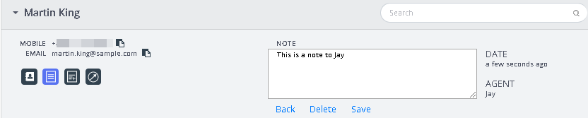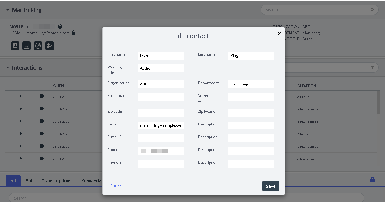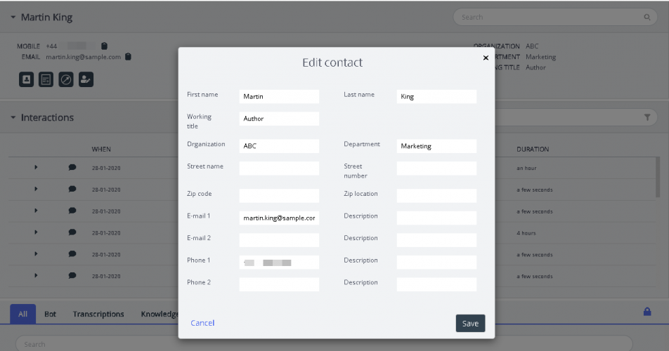If enabled by the admins, agents can add a new contact card information or edit the existing one.