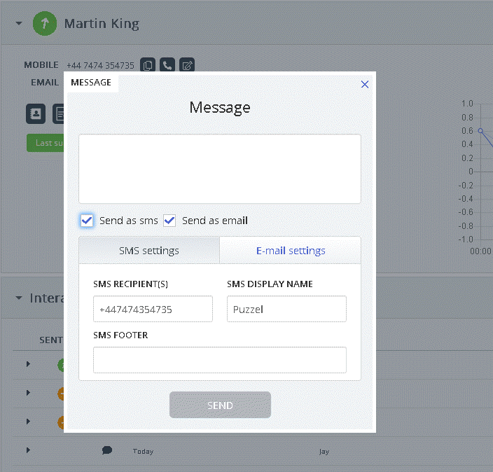 On clicking on the send message icon, the message window will pop up, populated with the available customer details as shown.