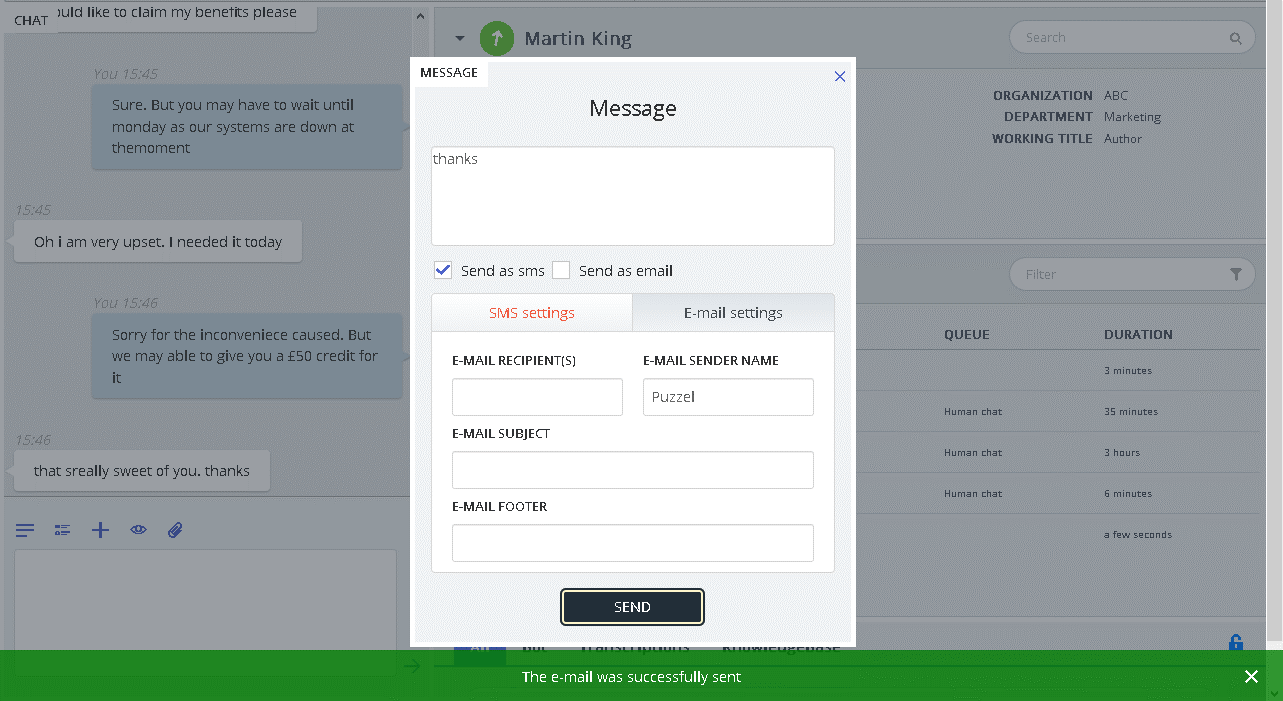 Agents can now send information via SMS or email to the customer during or after the interaction by clicking on the icon as shown in the picture below. Please note that the email/SMS service must be configured to your solution to be able to use this feature.