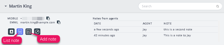 You can view historical notes to yourself or from other agents by clicking on the icon shown below. This provides a list, sorted from newest to oldest including the date, time, name of agent who created it and a snippet of the note content. You can click the note text to see the full note text.