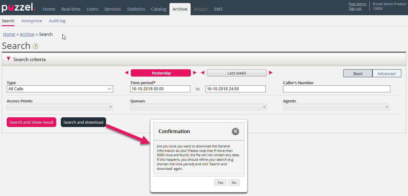If you click "Search and show result", we present max 100 requests in your browser even if the search returns more records (Search completed. Too many records found, 100 records shown). If you click "Search and download", we now allow max 5000 requests/rows in the file. The downloaded file will have the file name "Puzzel Archive data yyyy.mm.dd hh_mm_ss.xlsx". If the search returns more than 5000 rows, we will generate a file with no data and the filename "Too many rows - please narrow search.xlsx".