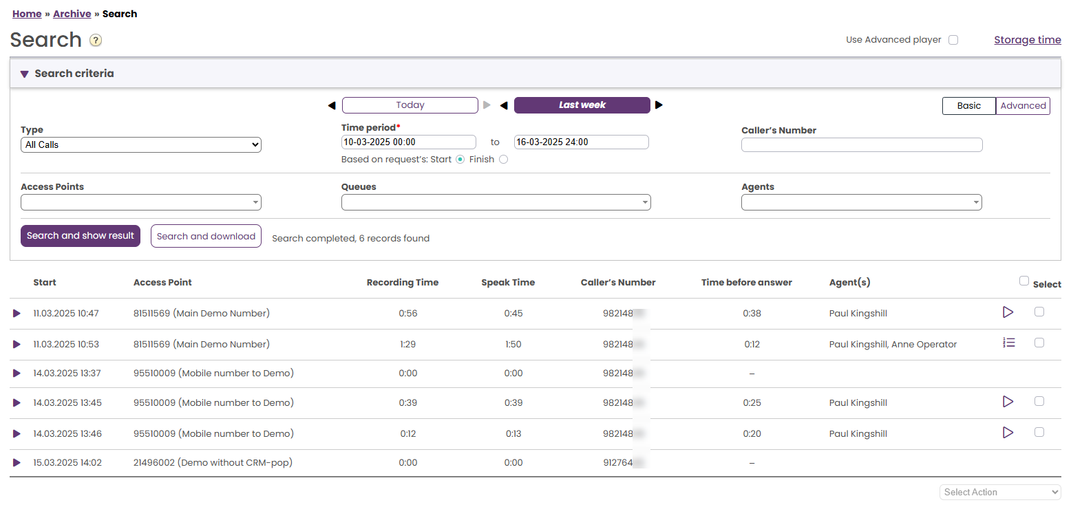 A Group number is listed in the Agents list box ("Unblockable <Group number name>") in the search part in Archive, but if you search for calls answered by such an agent, the search will return few or no calls.