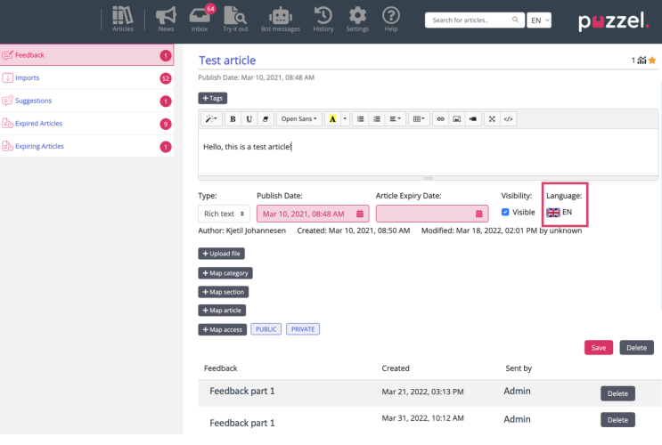 Administrators can now view a list of all articles containing feedback from agents in a new list view. By clicking on the article with a feedback, the article opens in the edit mode and the feedback related to it can be found at the bottom of the page. After the feedback has been reviewed it can be deleted using the delete button.