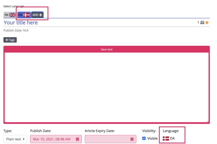 By default, the article will be created in the same language as the agent application interface, from where the suggestion was sent. You can create other language articles for the same content, by clicking icon at the top of the screen. This opens the editor for you to add content in the desired language. Note that some automatic tags are added to the article based on the content being added. You can add additional tags and save it.