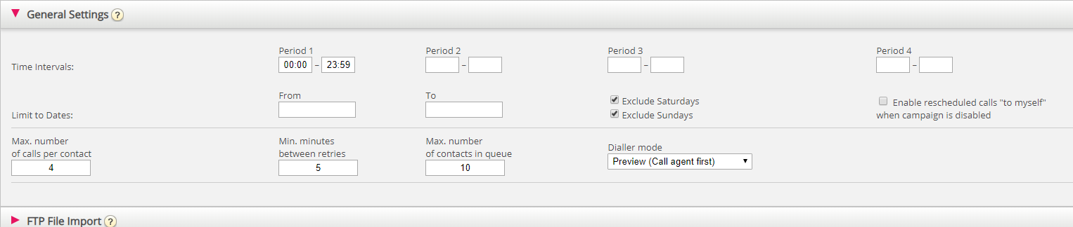 Only rescheduled contacts will be put into queue outside the defined time period(s). If you define more than one time period, they can't be overlapping. If Max. number of calls per contact is >1 and you have defined 2 or more periods, the Dialler will call contacts in the first period, and the contacts that did not answer will usually be called in the next period.