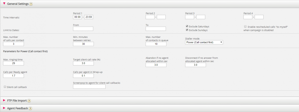 Example: With Period 1 set to 09:00-15:59 and Period 2 set to 16:00-20:59, and Max. number of calls per contact set to 3, the first call to a contact will be done in Period 1, and the contacts that (were not called or) did not answer in Period 1 will usually be called in Period 2, and the contacts that (were not called or) did not answer in Period 2 will usually be called in Period 1 the next day. - Enable rescheduled calls "to myself" when campaign is disabled: If an agent orders rescheduling "to myself", and the campaign is disabled at the rescheduled time, the call will be done only if this option is checked and the agent becomes ready at or max "Minutes reserved to this agent" minutes later.