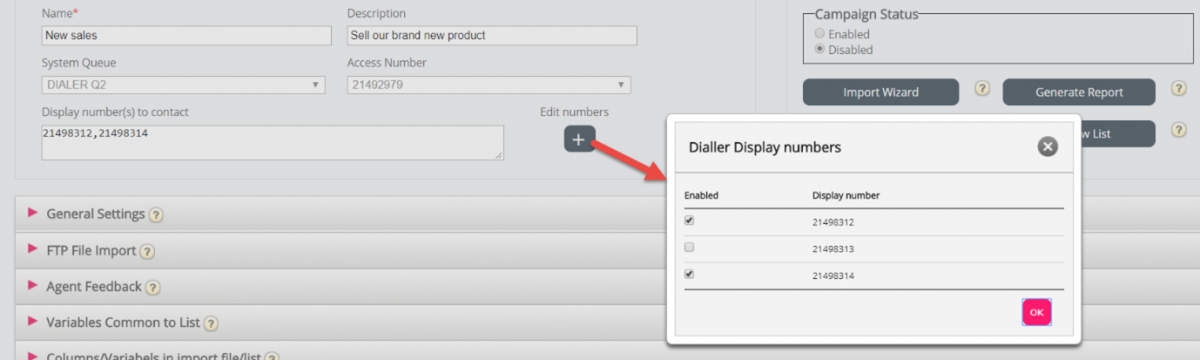 Please contact Puzzel support if you want to add or delete Display numbers from the list for a Dialler Campaign.