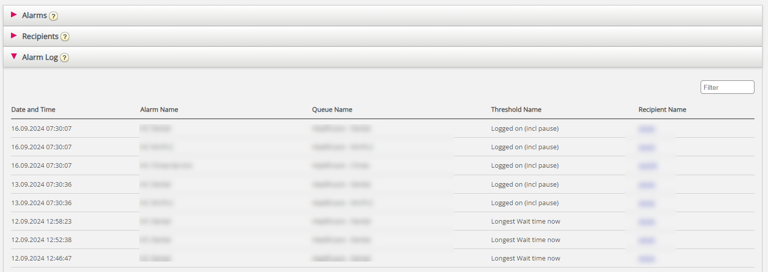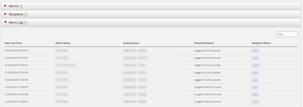 Here you can see a log of the alarms that have been sent to a recipient. If you have created an alarm but not defined that a recipient should receive it, it will not appear in the Alarm log. Each night, all log entries older than 3 months are deleted.