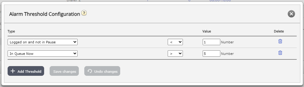 Here you can define the types of threshold and their values for the chosen KPI alarm on the selected system queue. One KPI alarm can contain one or more thresholds.