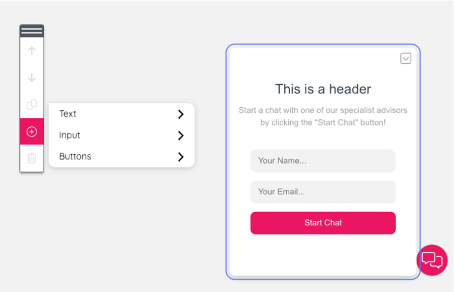a. Name, email and phone filed are fields that are predefined and expect a certain input format, for example an email address. The input field is a generic input field. This populates an input box where users can insert information relevant to their chat interaction.