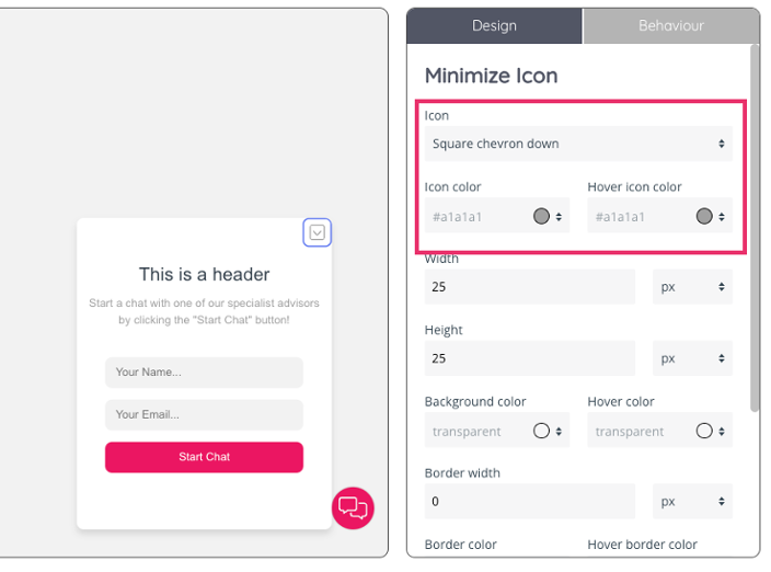 The minimise icon features design options to choose the icon type among the options in the drop-down menu, as well as the icon’s colour and the icon’s colour when the cursor hovers over it.